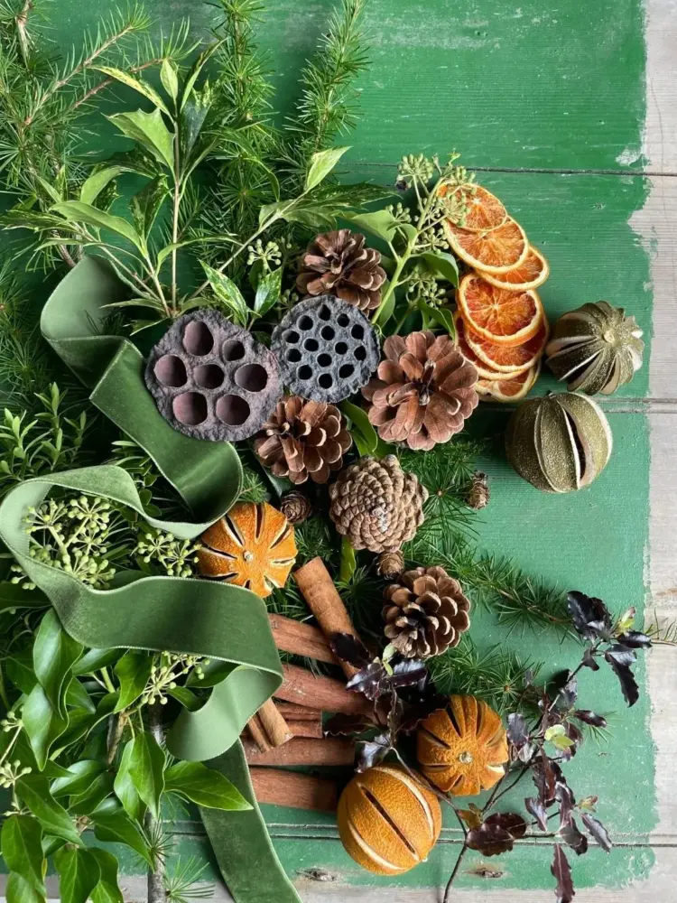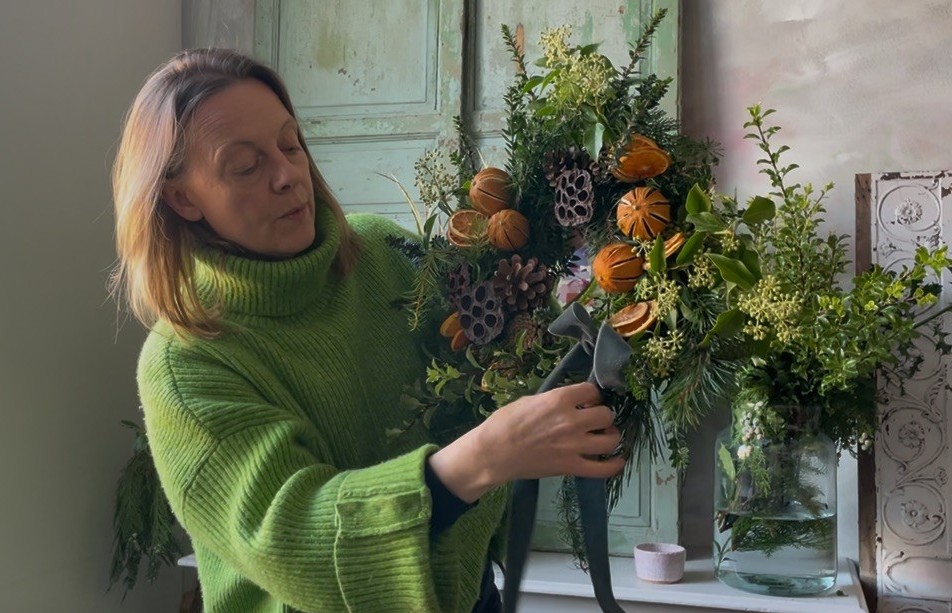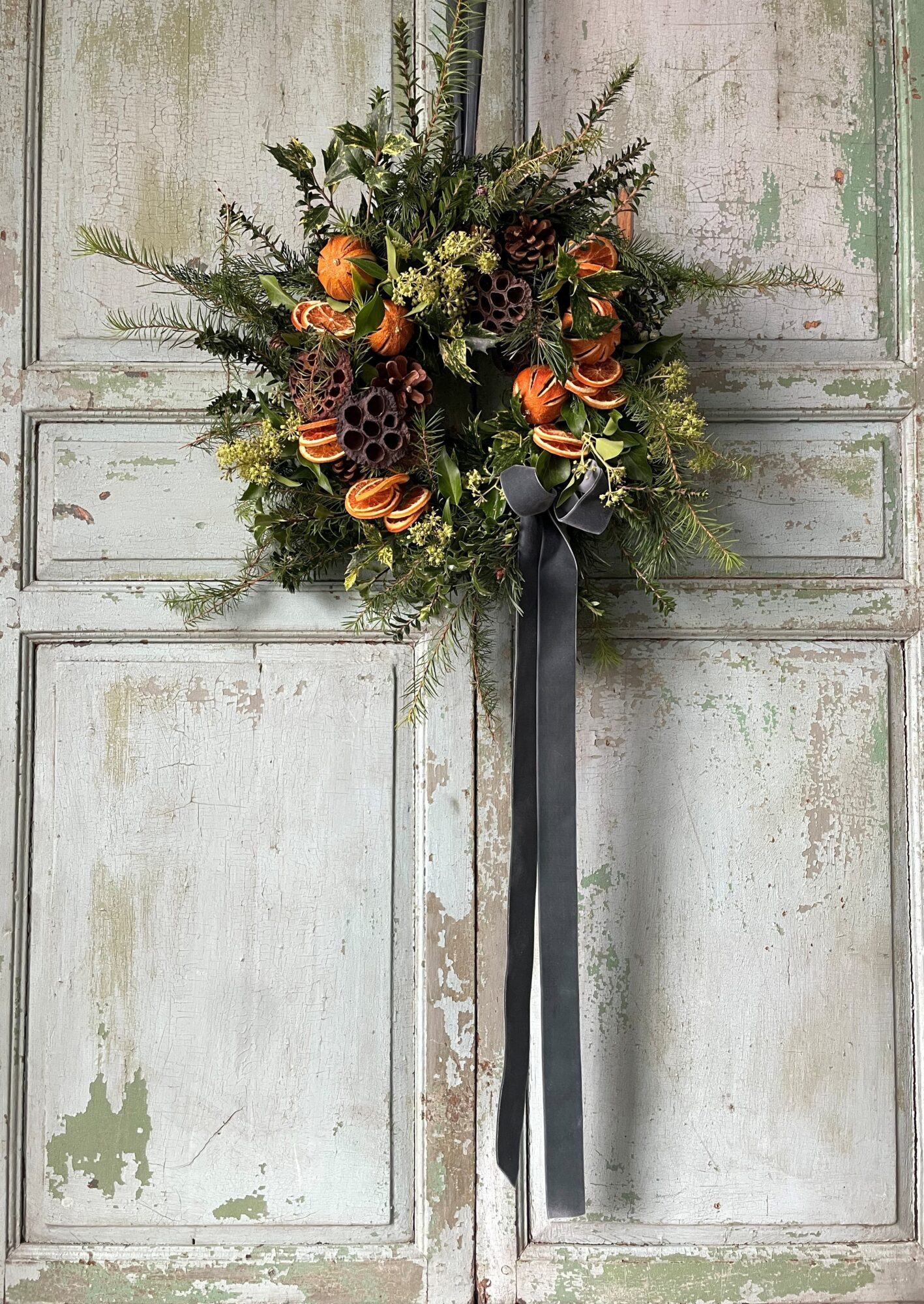 This two and a half hour hands-on workshop is designed to welcome all abilities. Guided by the experienced florist, Joanna, you will learn how to create a classic mossed base for your wreath. You will then adorn it using foraged foliage and a beautiful mix of seasonal evergreens, berries, and ribbons to make your own bespoke Christmas wreath. Finally, you will embellish your creation with classic decorations like dried oranges and finish it with a beautiful velvet ribbon bow.