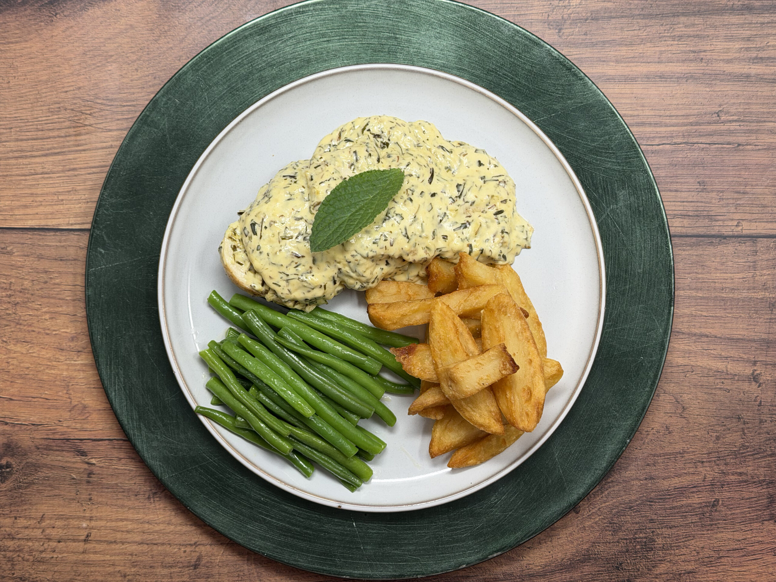 Chicken breast in cream & tarragon sauce. Served with sides of pomme frites & vegetables.