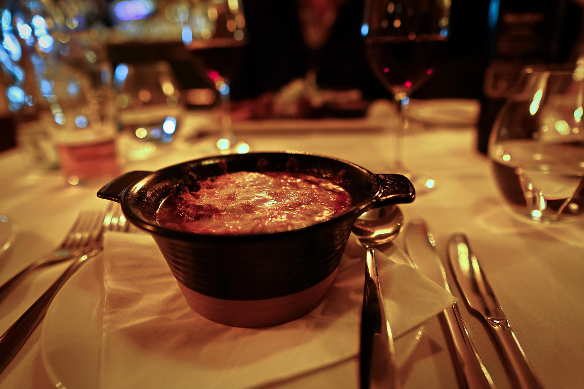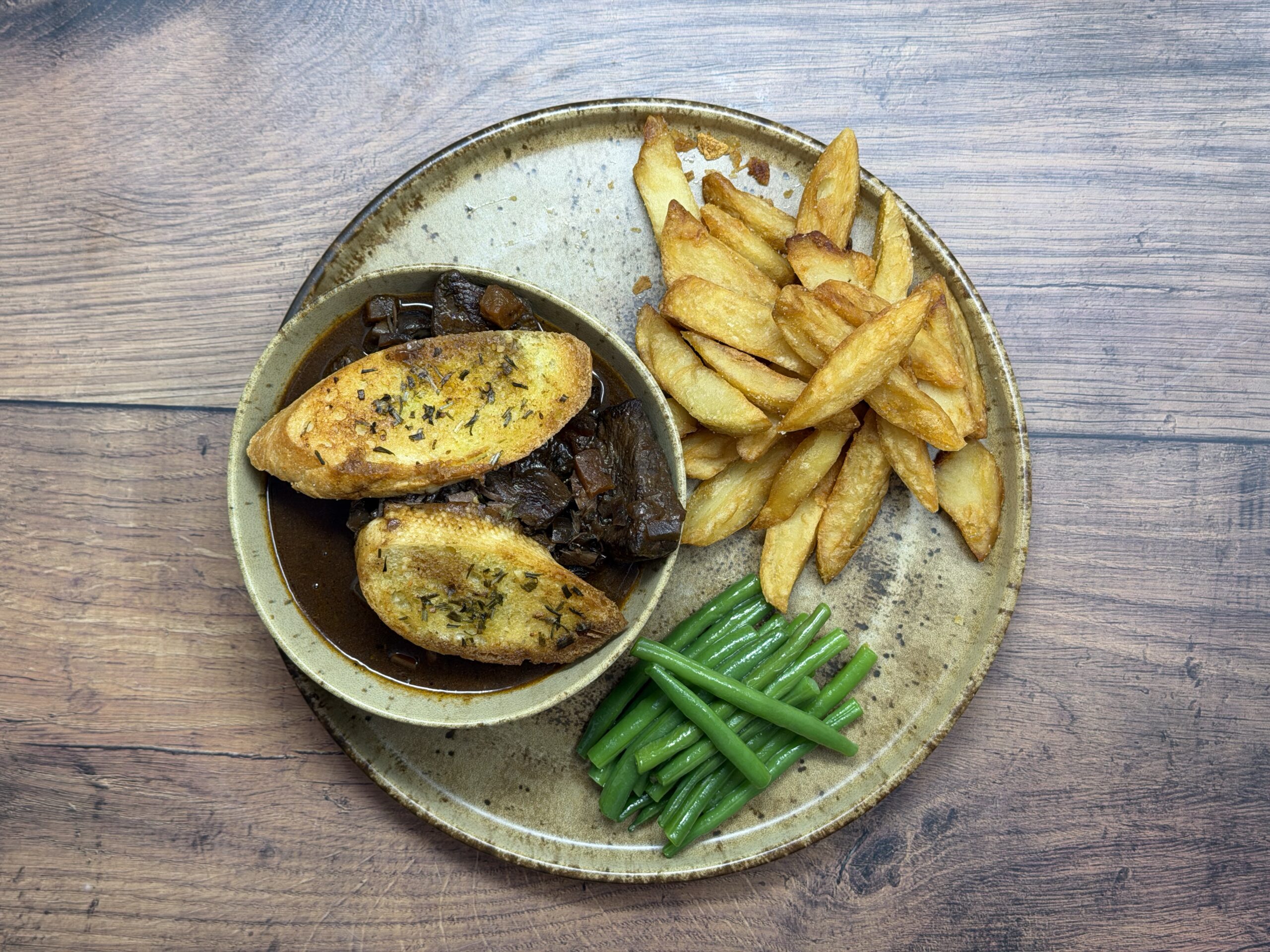 Braised beef in red wine with garlic croutons. Served with sides of pomme frites & vegetables.